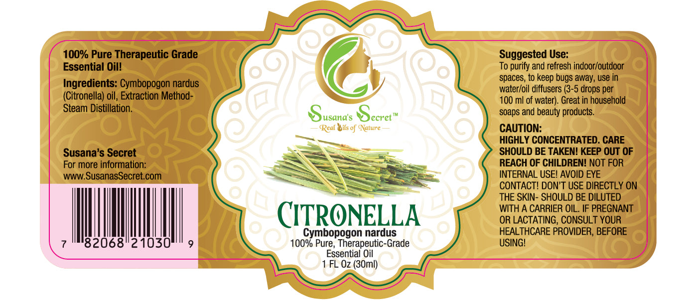 CITRONELLA Essential Oil, is a unique essence with a slight citrus aroma. Extracted from the leafy parts of the citronella grass plant (Cymbopogon nardus), a relative of lemongrass. This fragrant grass got its name from the French word meaning “lemon balm,” due to its floral, citrus-like aroma. Has been widely used for centuries in aromatherapy and for a variety of beauty and medical purposes. It is a common element in perfumes, cosmetic and in outdoor bug repellant products.